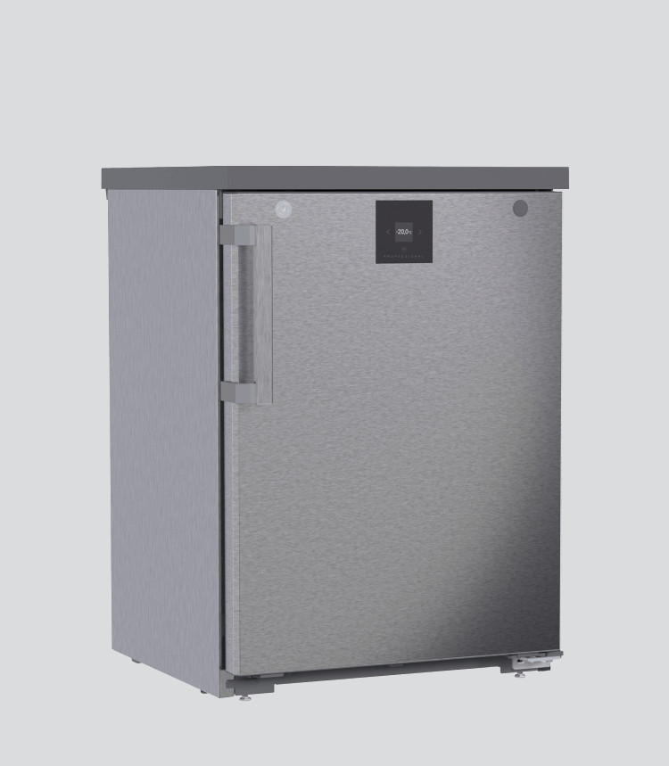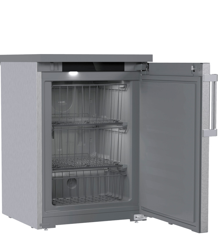 Semi-professionele onderbouw vrieskast, inwendig kunststof, voorzien van statische verdampers, electronishe regeling met temperatuuraanduiding, handmatig ontdooi-systeem. Rechtsdraaiende deur met r.v.s. greep, slot en